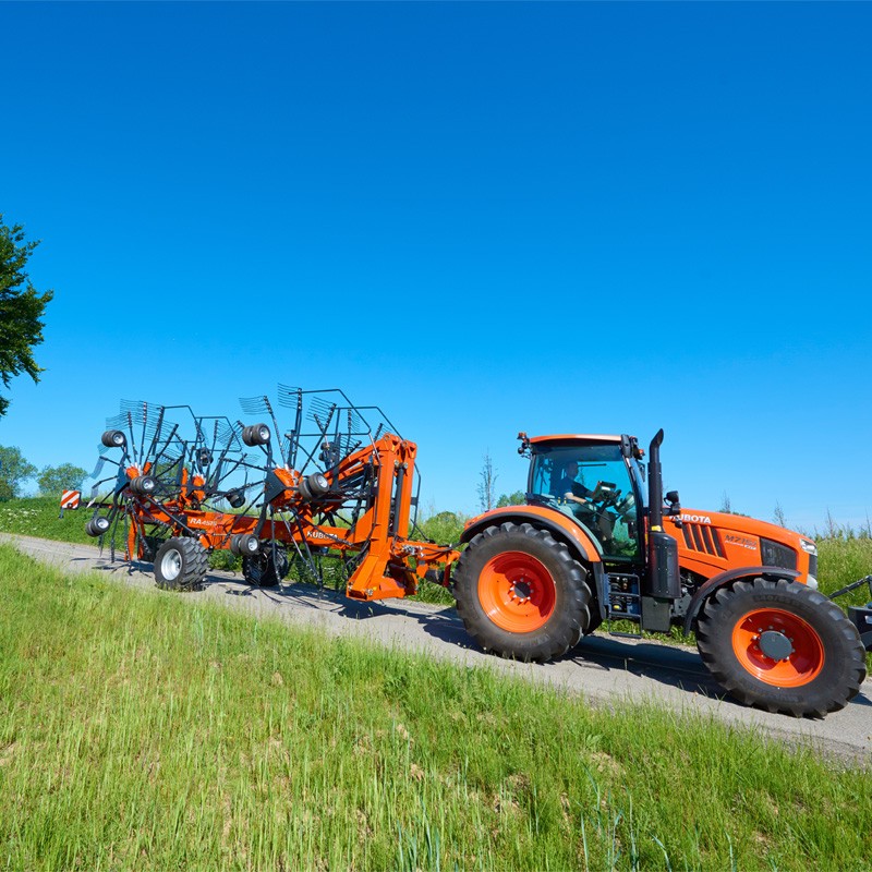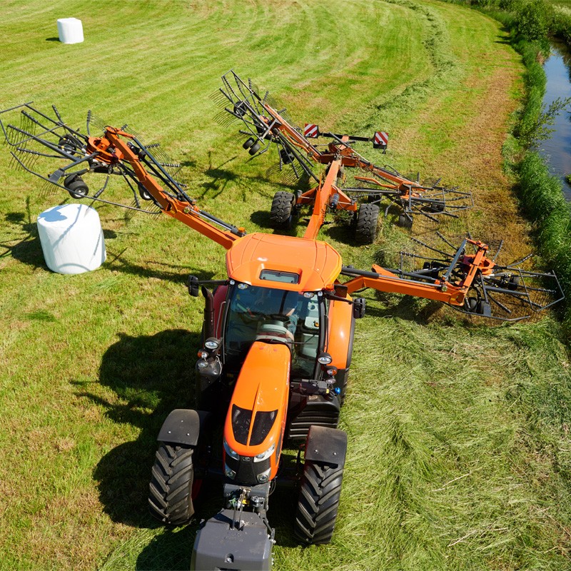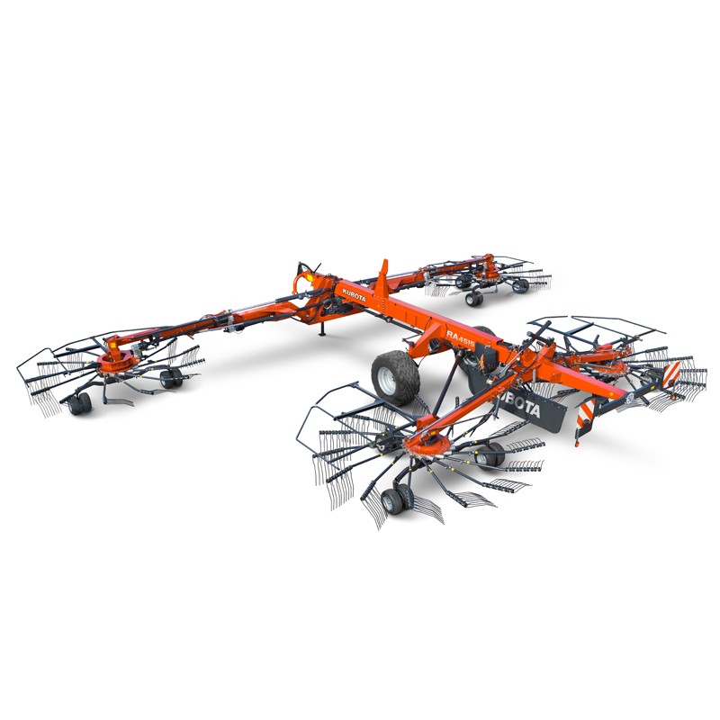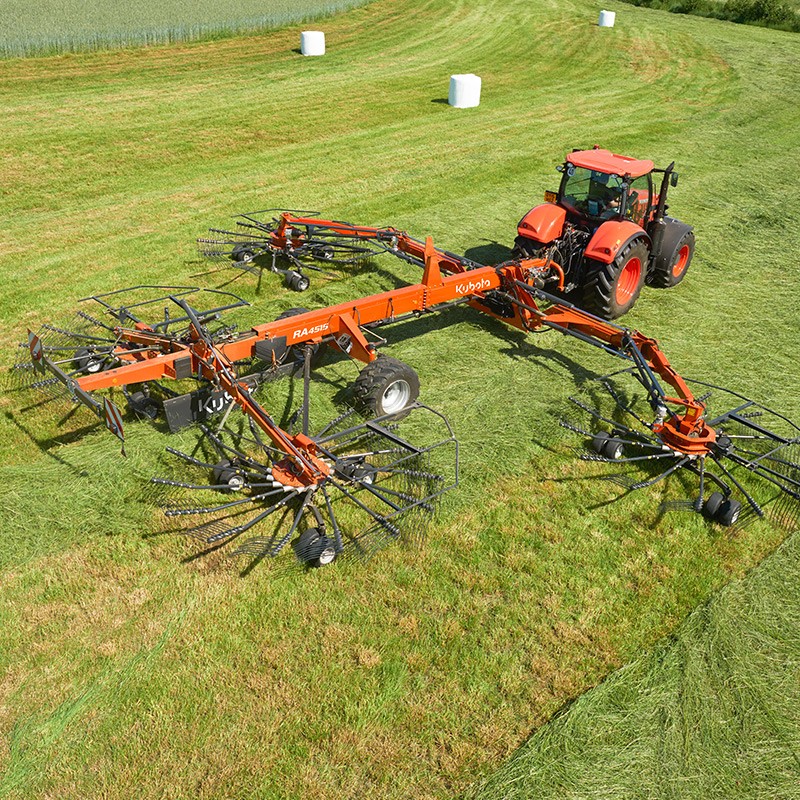 Le RA4515 est un andaineur performant à quatre rotors conçu pour les travaux lourds et intensifs. Doté de nombreuses technologies, il ne laisse aucune place aux compromis et s’adapte parfaitement à vos besoins. Les quatre rotors, le boîtier d’entraînement sans entretien, la largeur de travail de 15 m et la conception robuste du châssis principal ne laissent aucun doute sur le fait qu’il s’agit d’un andaineur destiné utilisateurs les plus exigeants. La conception spéciale du bras support de rotor avant est une véritable marque de fabrique du RA4515. Cette conception unique Kubota permet une plage de travail impressionnante entre 9,80 et 15 m.