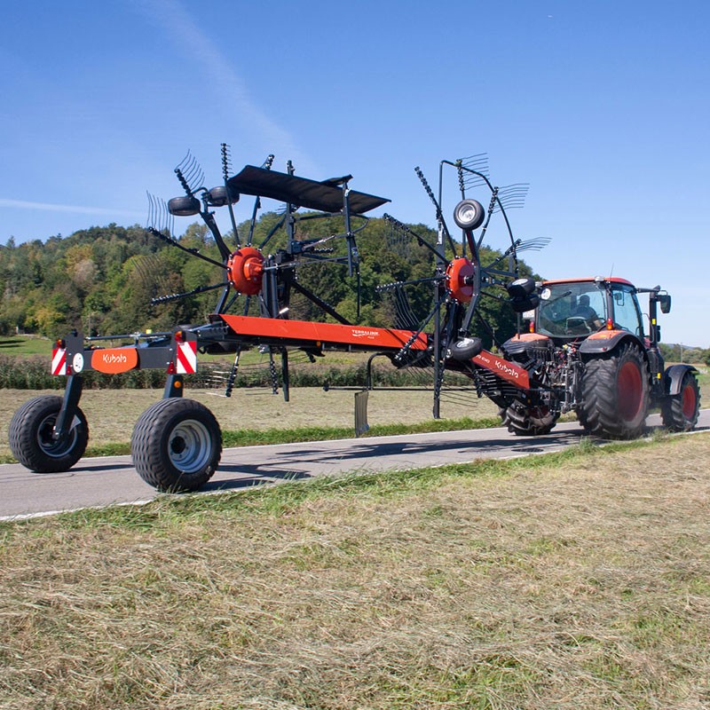 Les andaineurs KUBOTA RA2070 vario et RA2070 evo sont des andaineurs à andainage latéral avec des largeurs de travail de 6,65 à 7,85m.