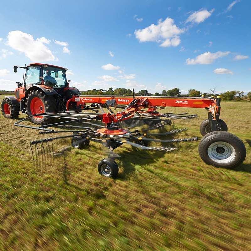 Les andaineurs RA2580, RA 2584, RA2590 hydro et RA2590 hydro comfort sont des andaineurs doubles rotors avec des largeurs de travail de 7 à 9m.