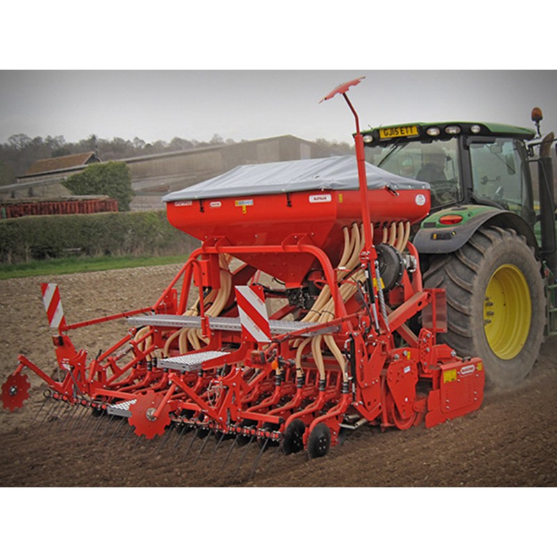 Une grande trémie de 1.500 l offre une grande autonomie, qui peut être augmentée jusqu'à 2.000 l au moyen de réhausse. Le poids de la trémie est reporté sur le rouleau, ce qui donne à la herse une liberté d'oscillation maximale et donc un fonctionnement facile même sur les terrains les plus difficiles. Ce système permet également de rapprocher le centre de gravité du tracteur, ce qui atténue le report de charge sur le tracteur.