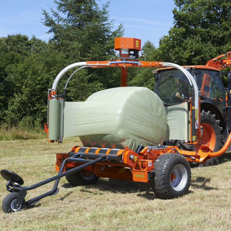 La Kubota WR1850 est une enrubanneuse à double satellite traînée pour les bottes rondes jusqu'à 1500kg.