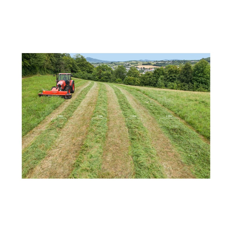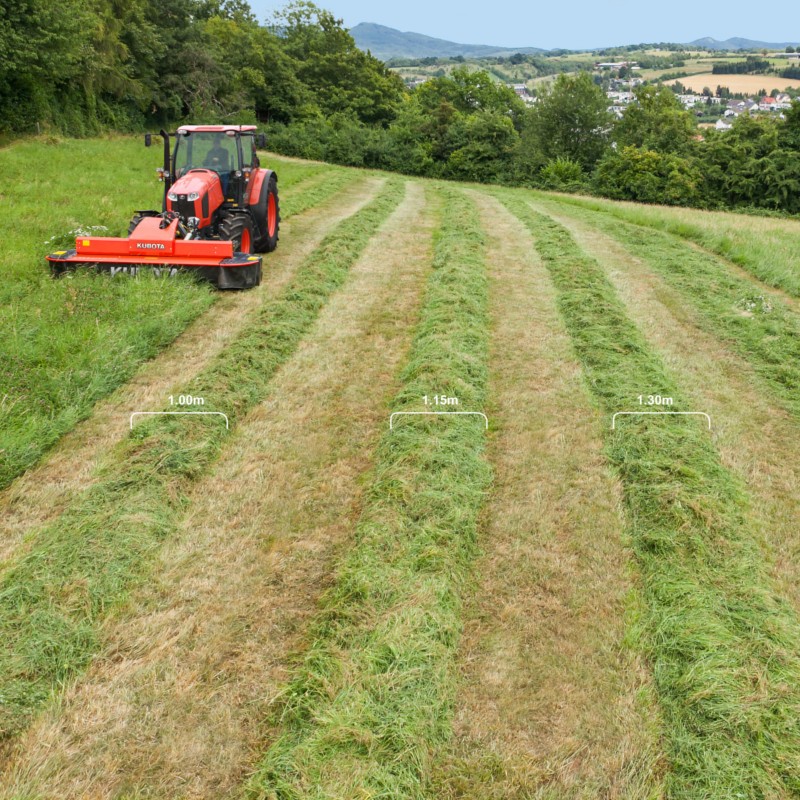Tout comme le reste de la gamme, la faucheuse frontale à disques Kubota DM4032S est équipée du lamier Kubota entièrement soudé. Profitant en plus des avantages du reste de la gamme de faucheuses Kubota, la DM4032S a la possibilité de réaliser 3 andains de largeurs différentes (1,00m, 1,15m et 1,30m) ou un andain large de 2,20m la machine offre une flexibilité maximum. Le choix se fait entre un andain étroit pour passer entre les roues du tracteur ou épandage large pour accélérer la vitesse de séchage.