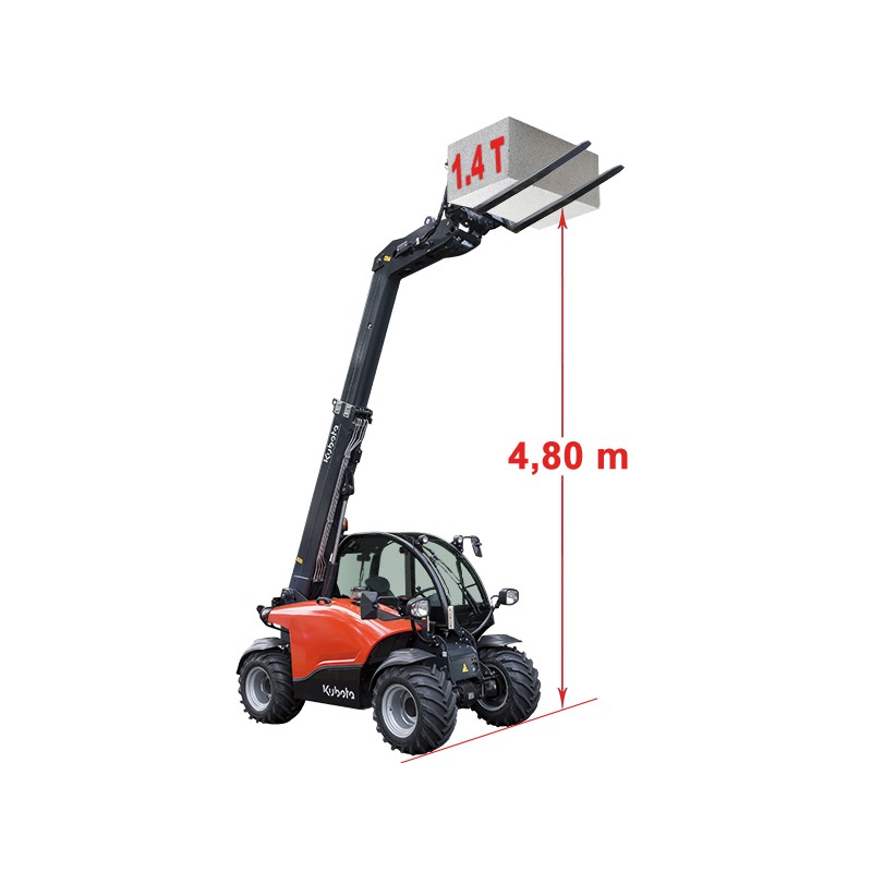 Le télescopique compact KUBOTA KTH4815 est capable de soulever une charge de 1400 kg à 4,8 mètres de hauteur, ce qui le rend unique dans sa catégorie.