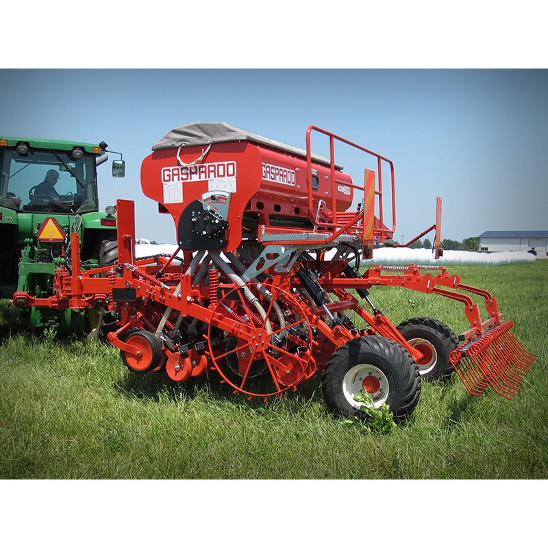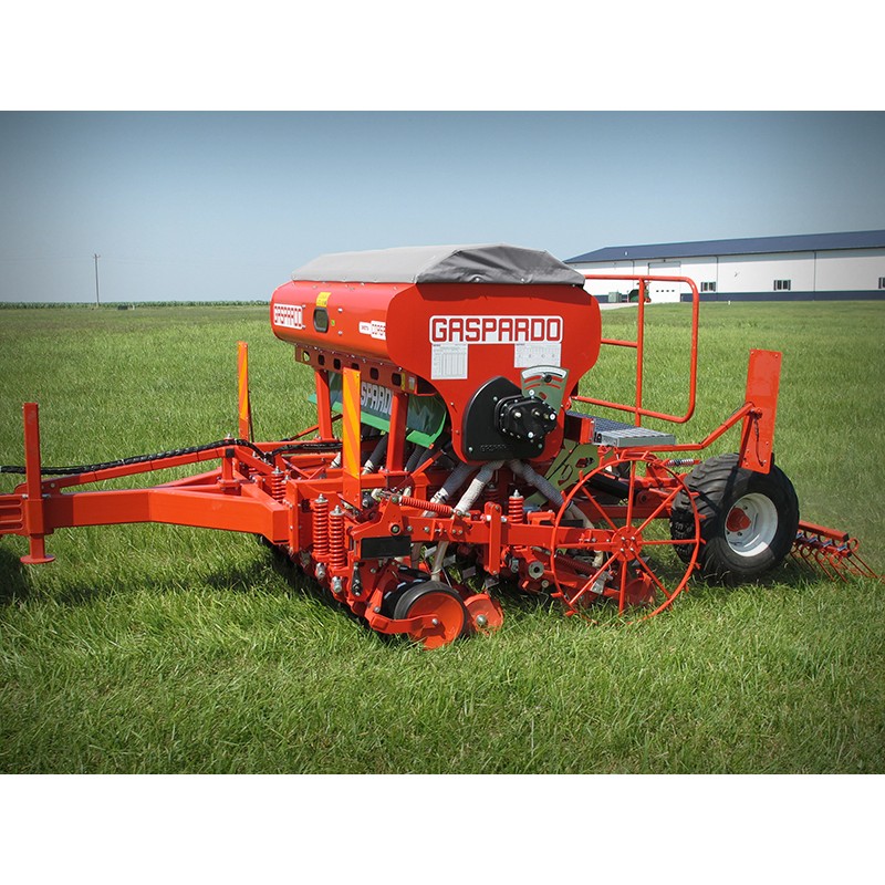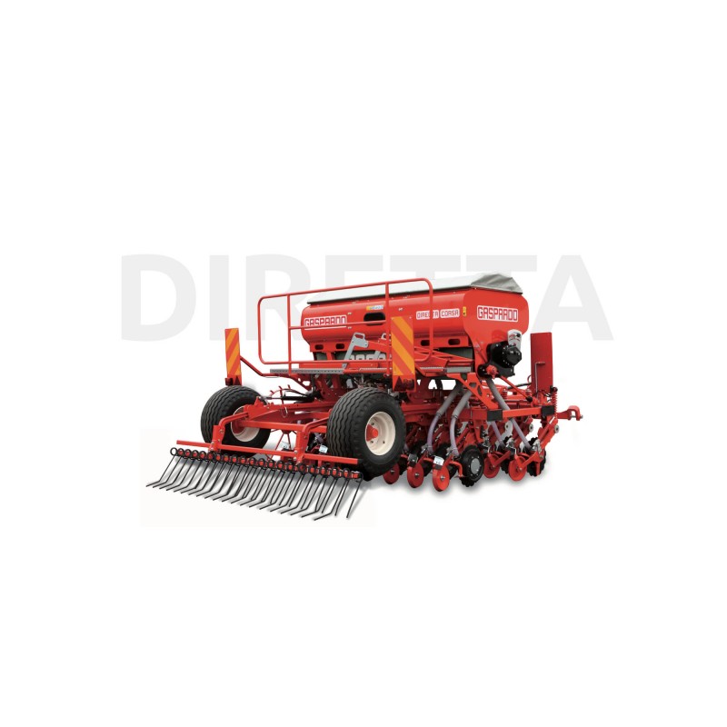 Le DIRETTA est équipé de l'élément semeur GASPARDO adapté au semis direct, capable d'exercer une pression de 260 kg sur les sols extrêmement durs. Cet élément est muni d'un disque crénelé avec un grand diamètre (475 mm) accouplé à un coutre en acier résistant et une roue de fermeture montée sur un bras indépendant avec. la profondeur de semis est réglable, ou bien par un changement de couronnes boulonnées sur le disque ouvreur, ou bien par le positionnement d'un axe.