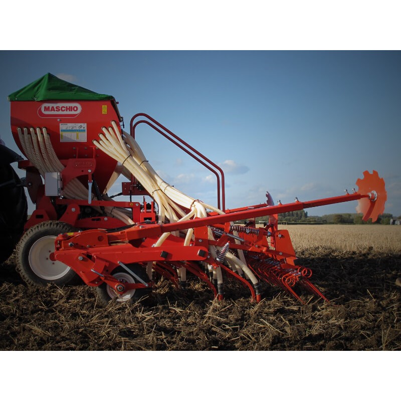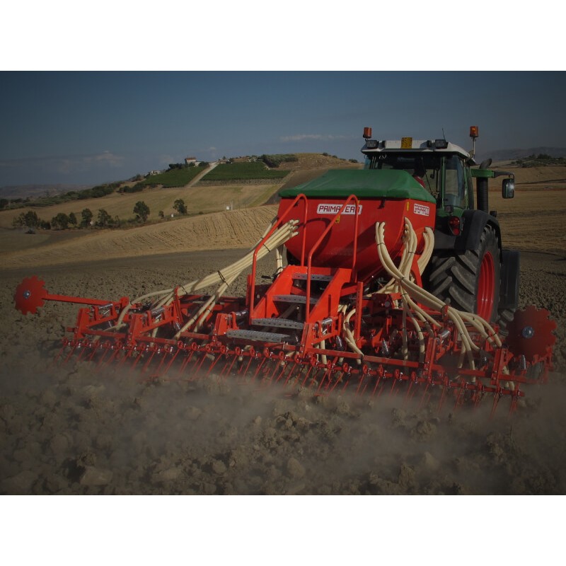 La distribution , précise et performante avec tout type de semence est actionné électriquement tandis que la distribution est pneumatique. Un châssis robuste avec une grande garde au sol, la disposition des éléments semeurs assurent un débit de travail satisfaisant même en présence de pierres et de résidus de récoltes abondants. La bonne capacité de la trémie de 1500l garantissent une productivité élevée.